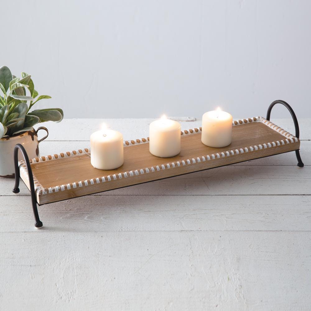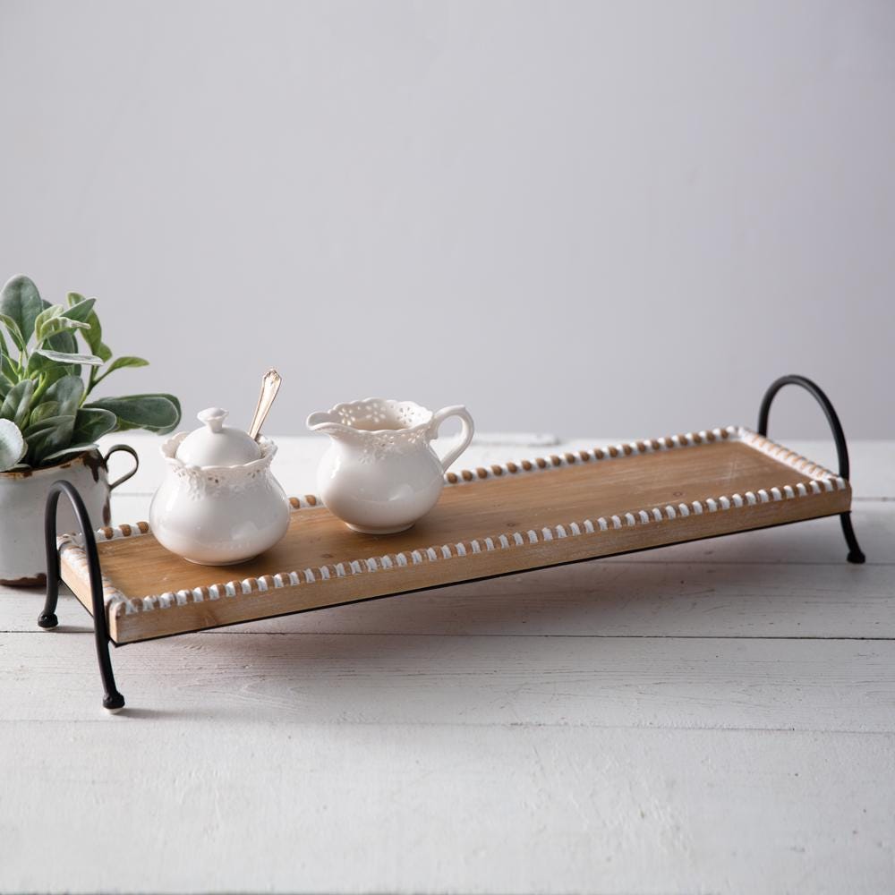 Give your condiments a leg up in the kitchen with this raised wood and metal tray. Perfect for organizing and displaying, this beaded wood tray sits on a sturdy metal frame. No accessories included.