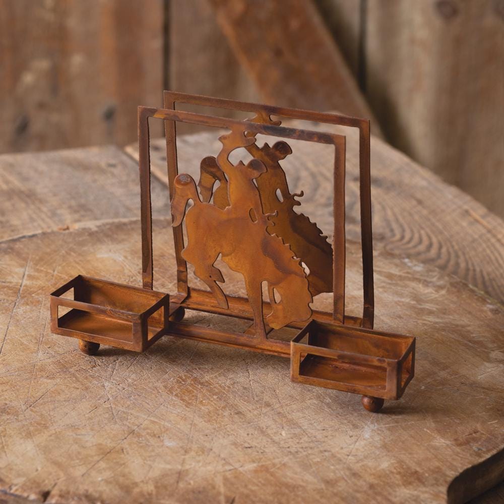 Our western caddy will lasso you in with its daring cowboy, precious salt and pepper shaker boots, and rustic finish. Display on a table for easy access to salt, pepper, and napkins during a meal. Please wash shakers before use.
