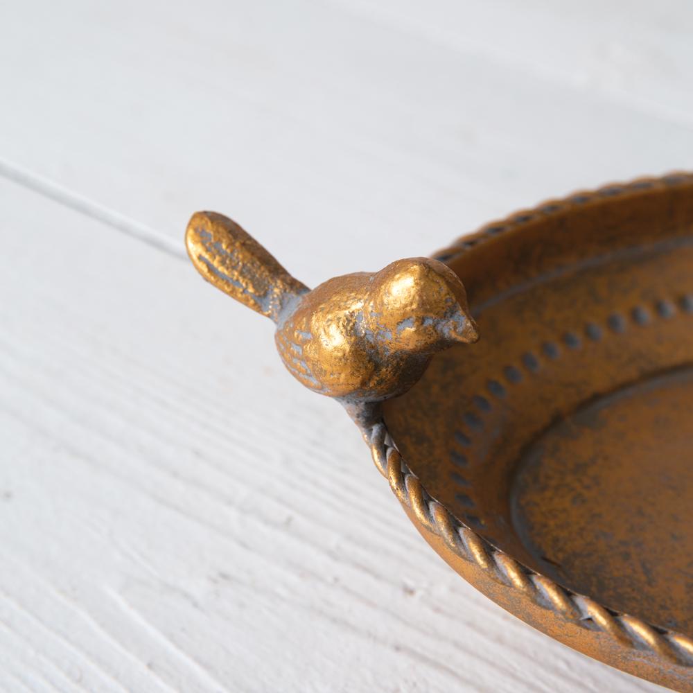 Feature your precious jewels or tealights inside this elegant trinket dish. Place on a vanity table or in a front entryway. Metal tray is polished with an antique gold finish that dazzles in the light.