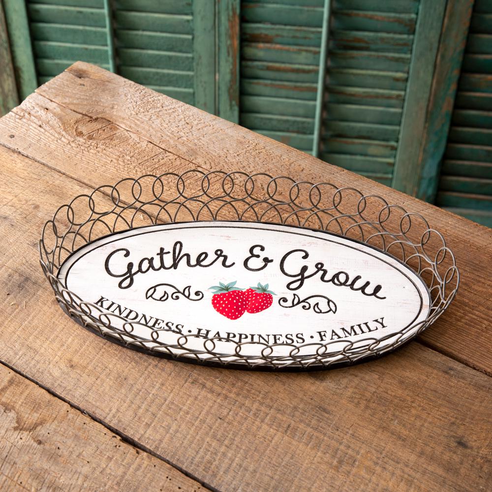 Add a little cheer to your space with this fun Gather & Grow Strawberry Tray. The bottom of this tray is made of wood with wire surrounding.