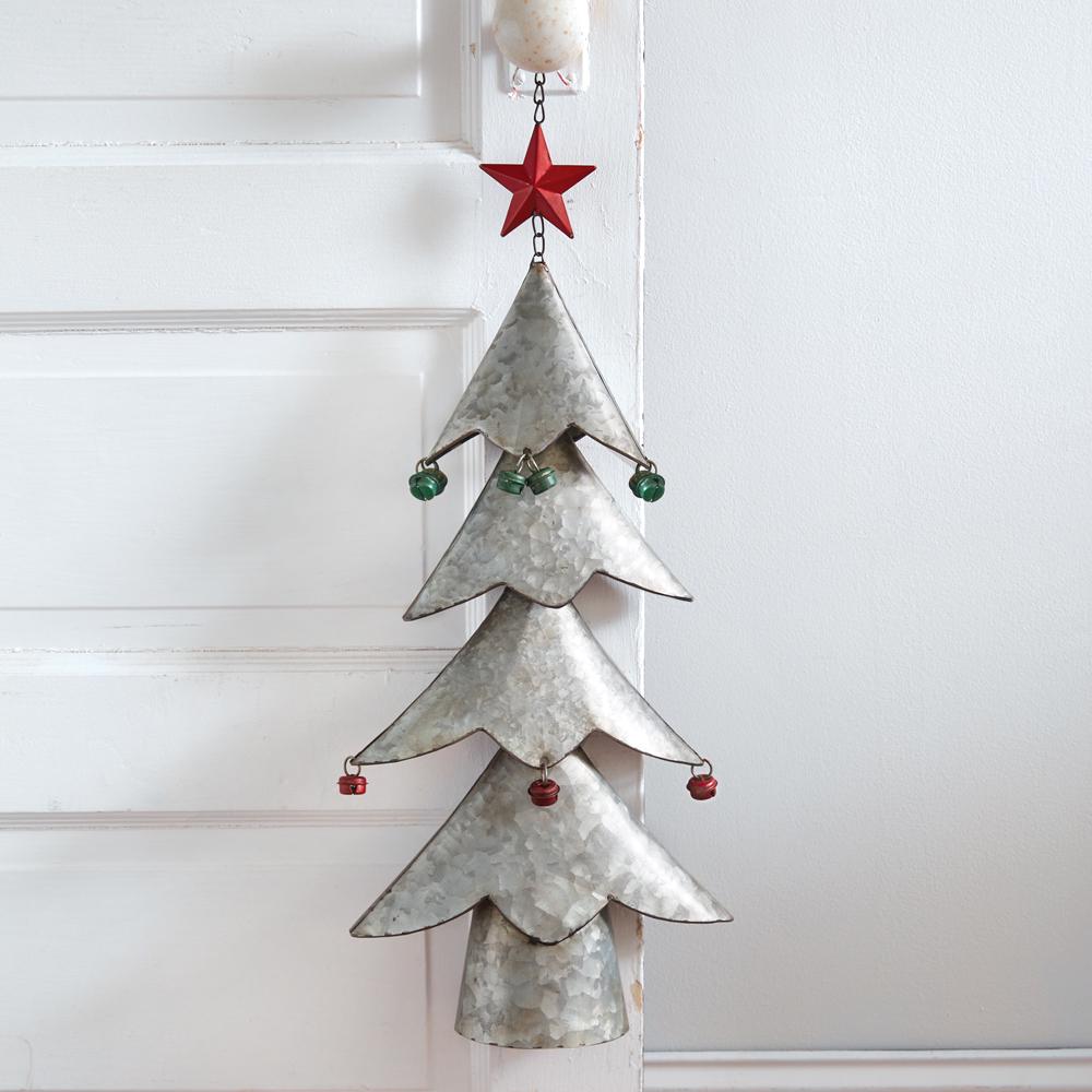 Abstract and quirky, this hanging Christmas tree is a fun way to bring Christmas decor into a home. The tree is made of metal and features a chain to hang. Item collapses for easy storage.