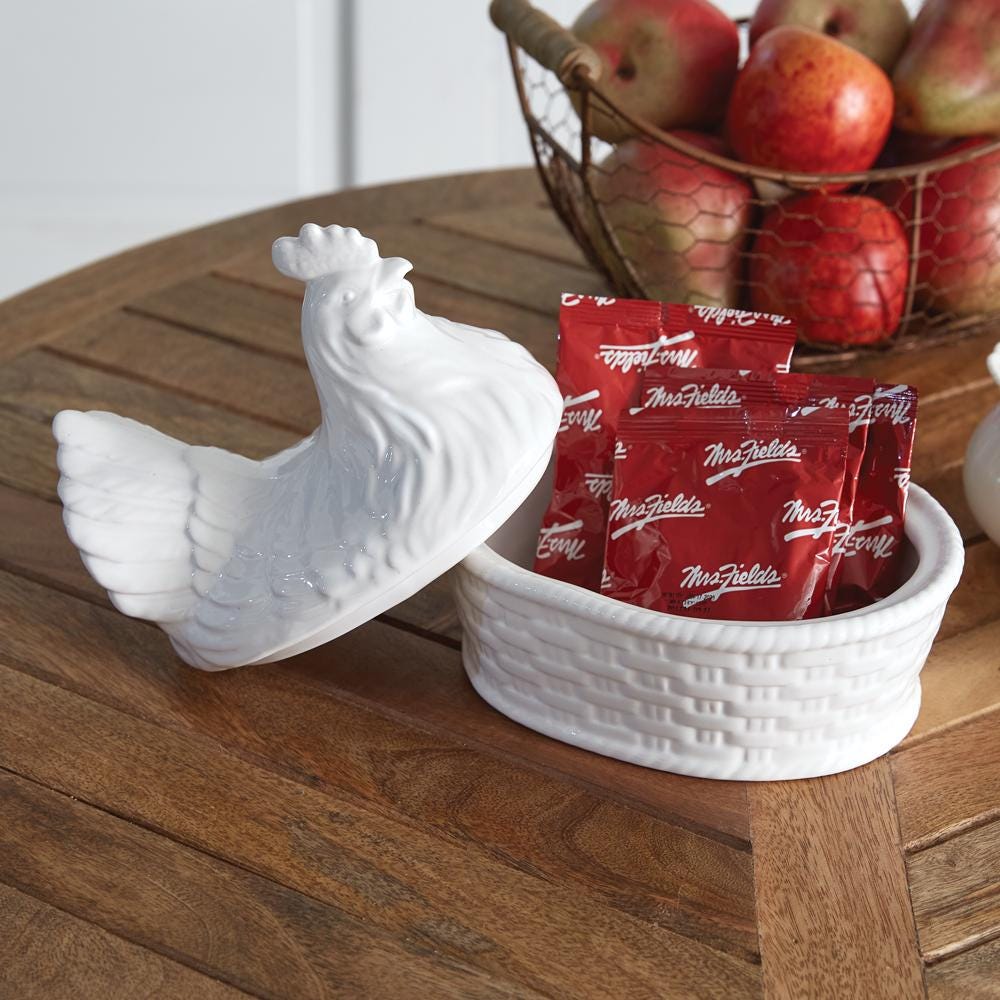 This blast from the past is the perfect addition to a farmhouse kitchen. Store fresh eggs, candy, keys, or jewelry inside to prevent cluttering the counter. Item is made of ceramic and is food safe.