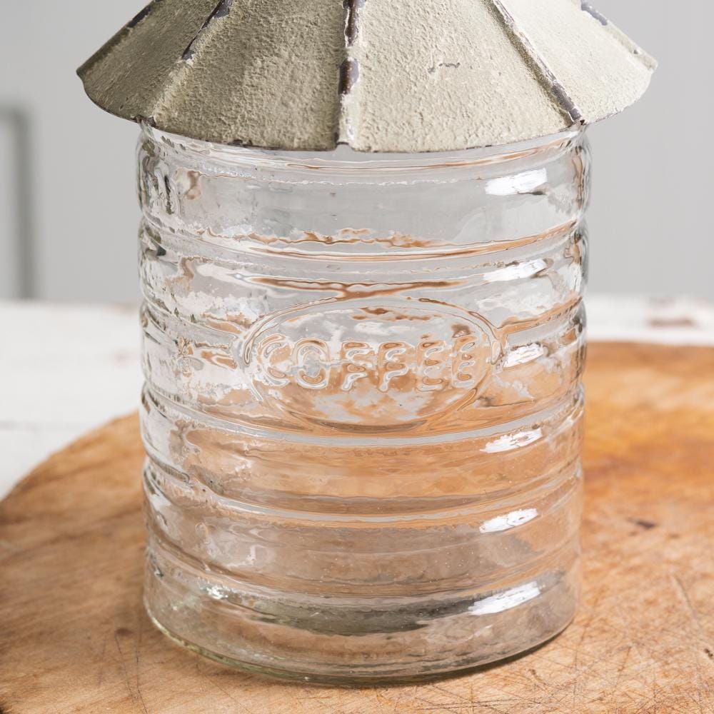 The large vintage silo canister is created with a glass canister and a rustic metal lid with a bird. The front of the glass has a small coffee emblem. Glass cylinder has a diameter of 5''. This item is food safe, wash before use.