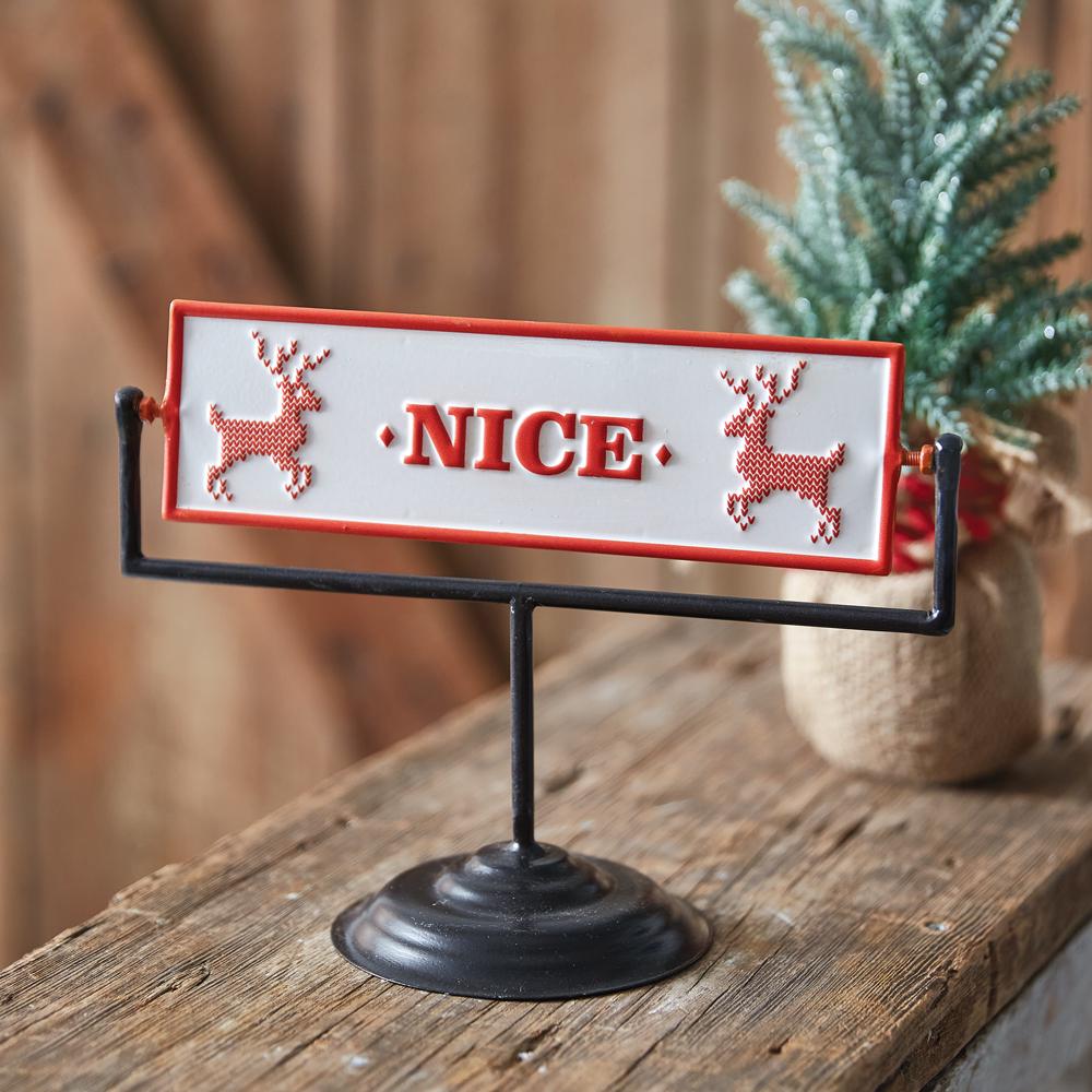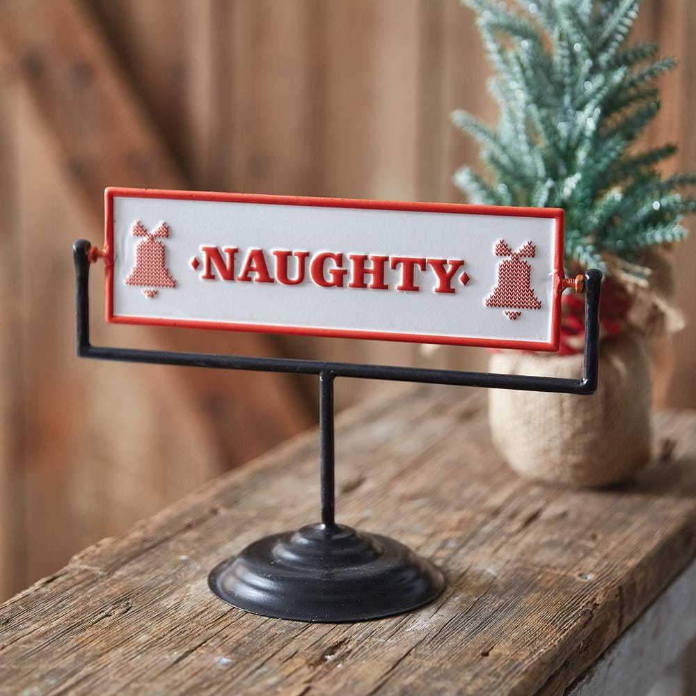 This charming and interactive tabletop sign is the perfect addition to your home or office, bringing a touch of whimsy to your holiday celebrations. It features a dual-sided design with "Naughty" and "Nice" written on each side. Simply give it a spin to reveal your mood for the day, or let your guests choose their designation with a playful twist. This item is crafted from metal.