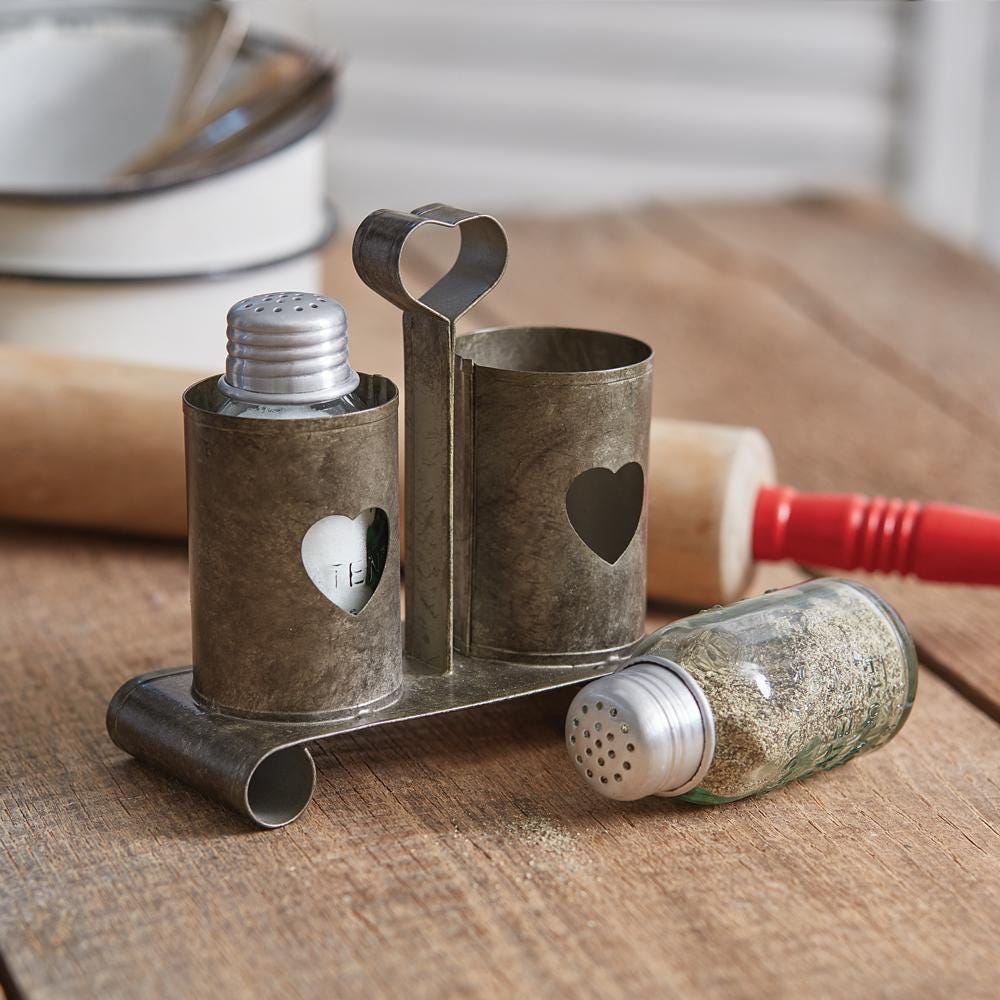 Our heart is full of joy from this salt-and-pepper caddy! The heart-cut tin evokes a sense of craftsmanship that harks back to simpler times, adding a unique character to your decor. Please wash shakers before use.