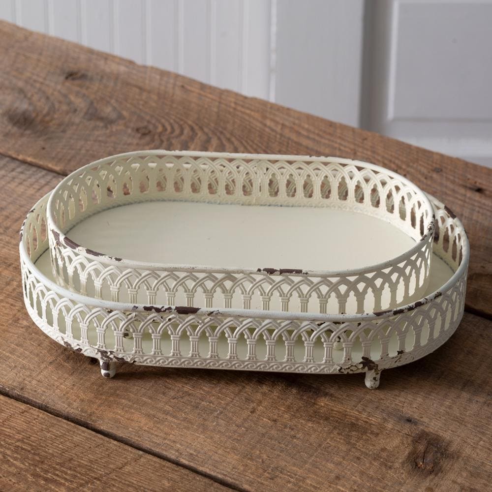 Organize your vanity with these elegant trays. They provide ample room for jewelry, perfume, and other small trinkets. Item is made of distressed metal. Smallest measures 11''W x 6¼''D x 2¾''H.