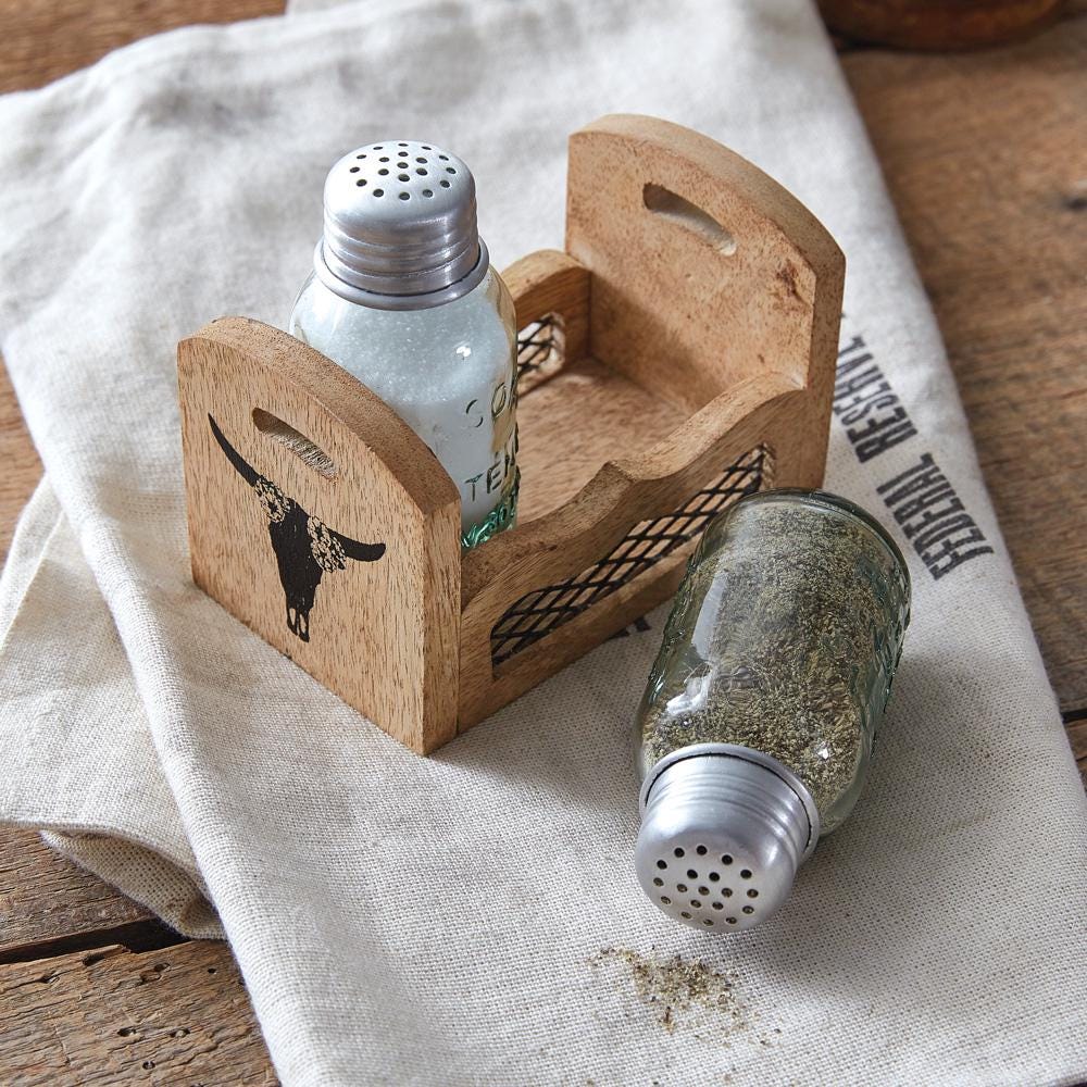 Curated with a bullhead motif, our salt and pepper caddy will bring Western charm to a dining table. Caddy is fashioned of mango wood and wire mesh. Please wash shakers before use.